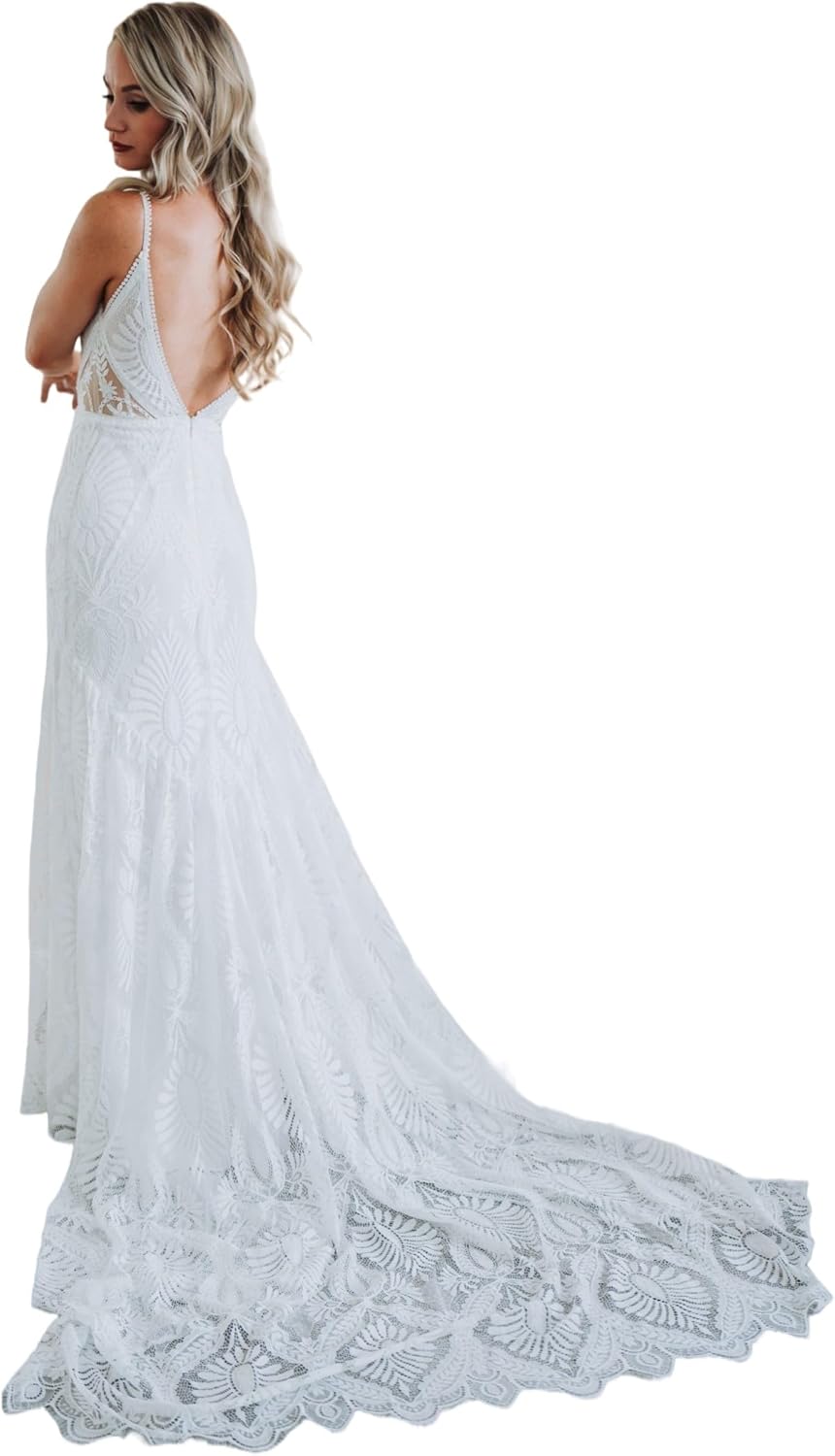 Beach Boho Wedding Dresses Spaghetti Straps Lace Mermaid Bridal Gowns with Train Deep v-neck bohemian bridal gowns Mermaid lace boho wedding dresses