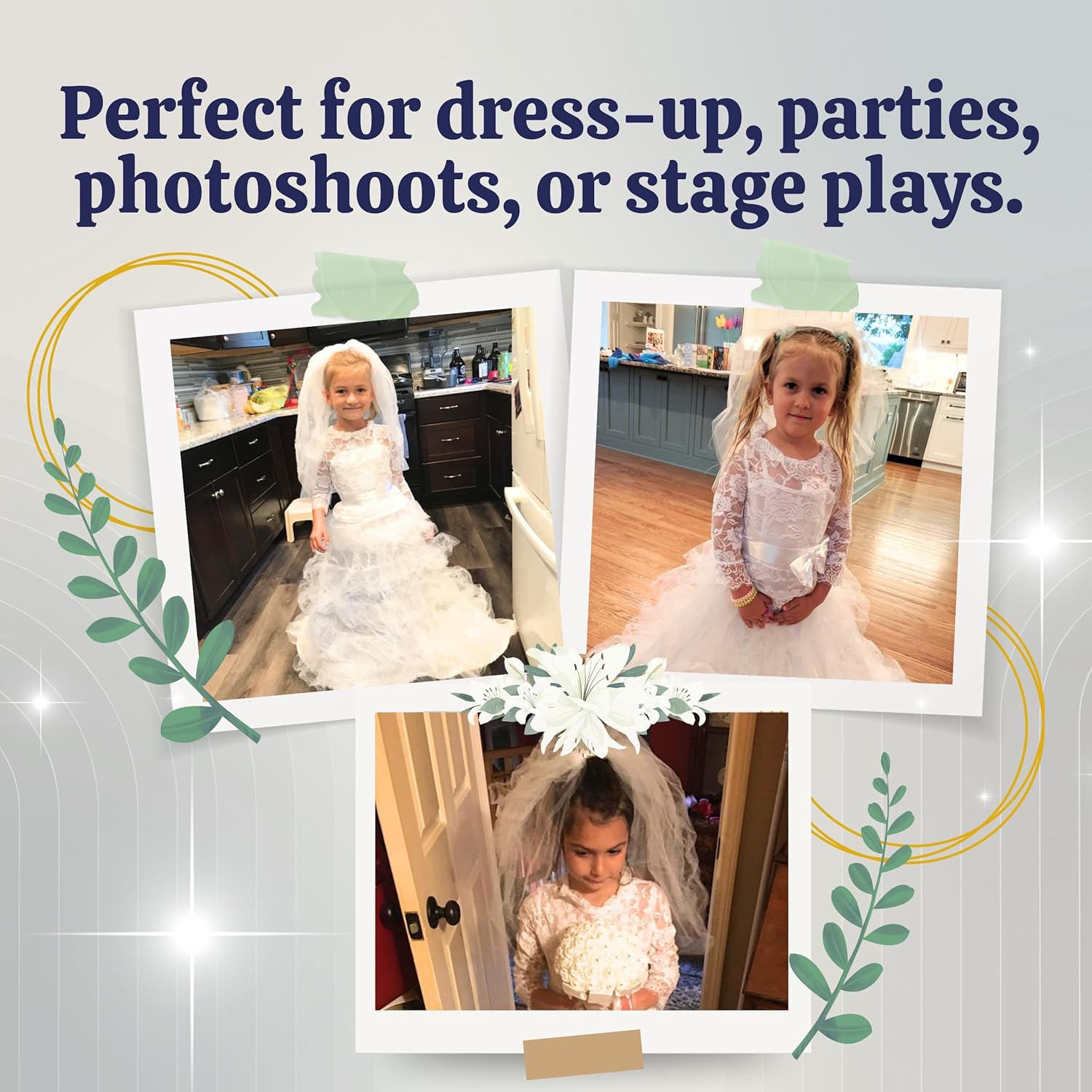 The gown comes with a zipper in the back for easy closing and the satin white belt has a bow in the front and a velcro in the back for an easy and comfortable fit. The white veil includes a hairpiece. The gown is made up of high-quality design for the utmost durability and comfort.