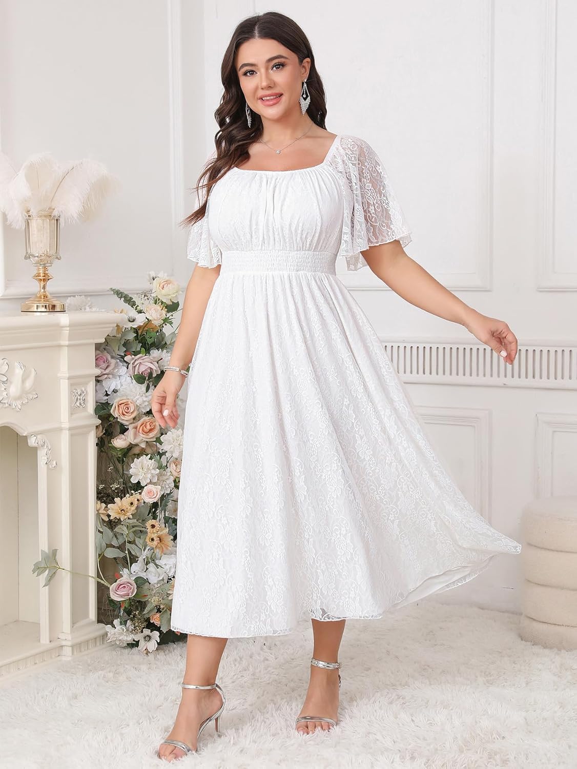 The video showcases the product in use.The video guides you through product setup.The video compares multiple products.The video shows the product being unpacked. Women’s Plus Size Wedding Guest Dress Merchant Video