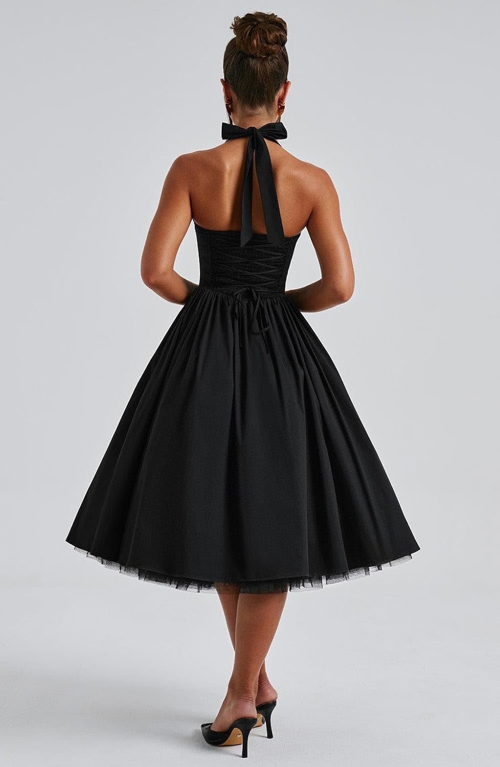 Women Summer Halter Dress Low Cut Sleeveless A Line Tulle Swing Flowy Tea Length Dress Corset Prom Formal Ball Gowns Specification: Materials: 95% Polyester, 5% spandex Pattern: Solid Color: Black/White/Red Neck: Halter neck Package Contents: 1 * Halter dress
