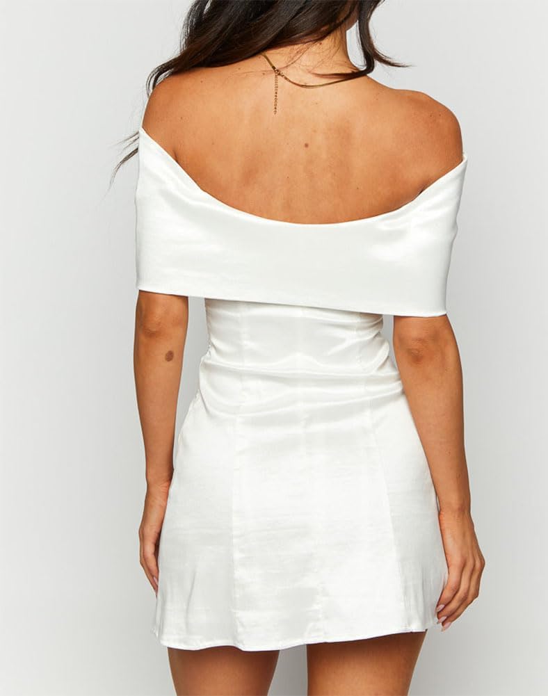 Women Elegant Off Shoulder Bow Front Satin Mini Dress Party Club Cocktail Dress