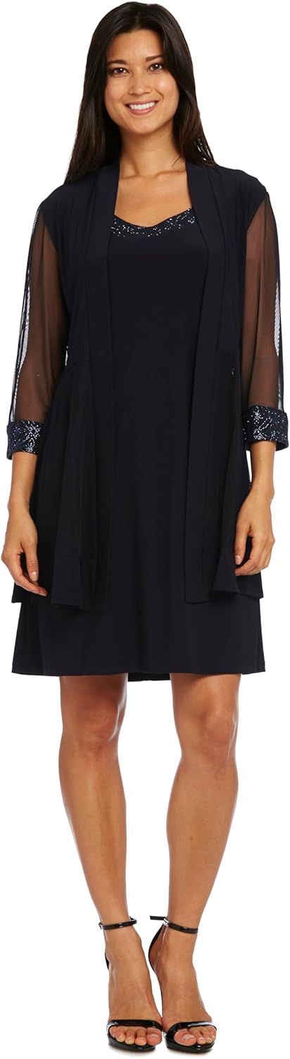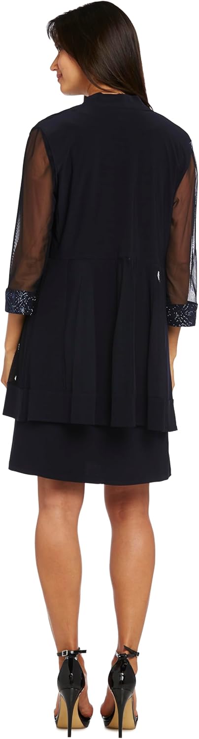 Step into timeless elegance with this graceful ensemble from R&M Richards, a refined two-piece set designed to make a lasting impression. The pleated 3/4 sleeve jacket features modern mesh insets that lend a light, airy feel, while the coordinating sheath dress dazzles with a delicately embellished neckline. The knee-length cut offers a graceful silhouette, perfect for weddings, cocktail hours, and elegant evenings. Whether you’re dressing up for a celebration or attending a special event, this ensemble combines comfort, beauty and confidence in one unforgettable look.