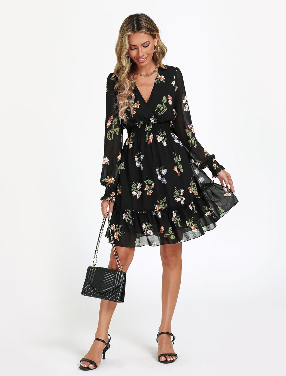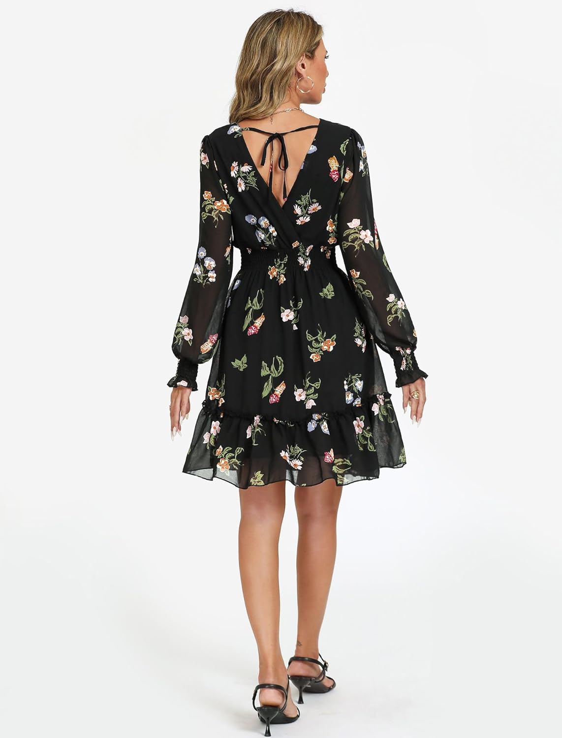 Prettywear Women’s Floral Chiffon Long Sleeve Mini Dress Flowy A-Line Wrap Neck Tie Back Short Dress