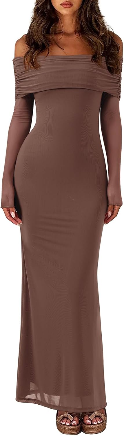 REORIA Women Off Shoulder Long Sleeve Dress Elegant Sexy Stretch Mesh Double Lined Slim Trendy Long Dresses