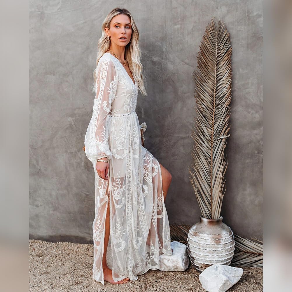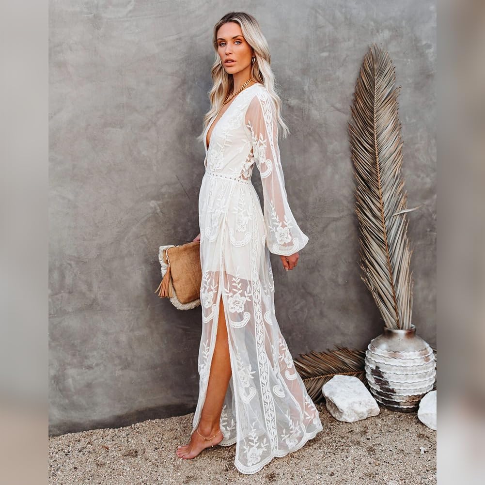 Women’s Boho Dress V Neck Floral Lace Ruffle Long Maxi Dress Beach Dress