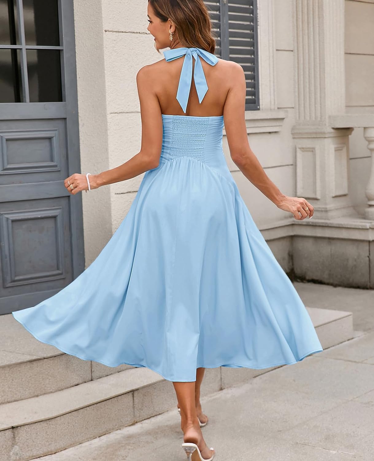 women’s casual dresses with halter V-neck, bow tie smocked back, flowy A line hem, sleeveless and a hidden side zipper, perfect wrap your body.