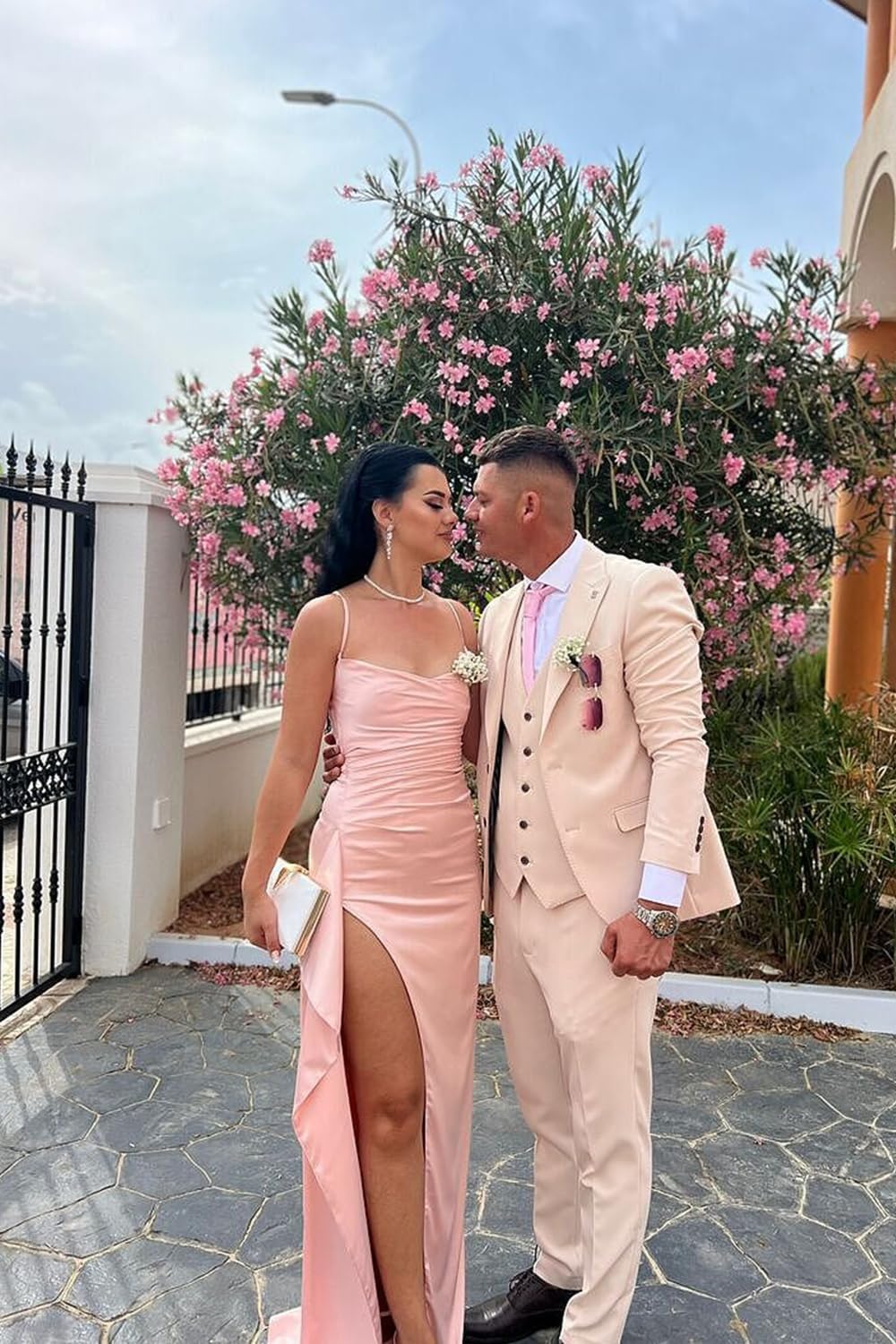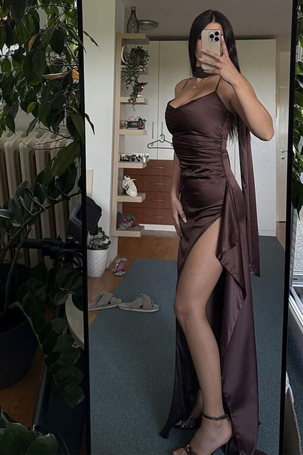 Women’s Spaghetti Straps Prom Dress Sleeveless Satin Pleated Formal Dress with Slit 2025 LN89
