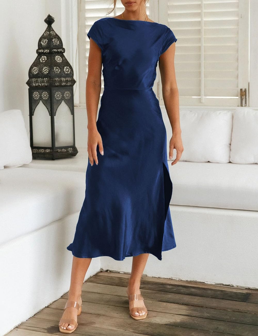 Women’s 2023 Summer Satin Cap Sleeves Long Dress Elegant Slit Midi Dress