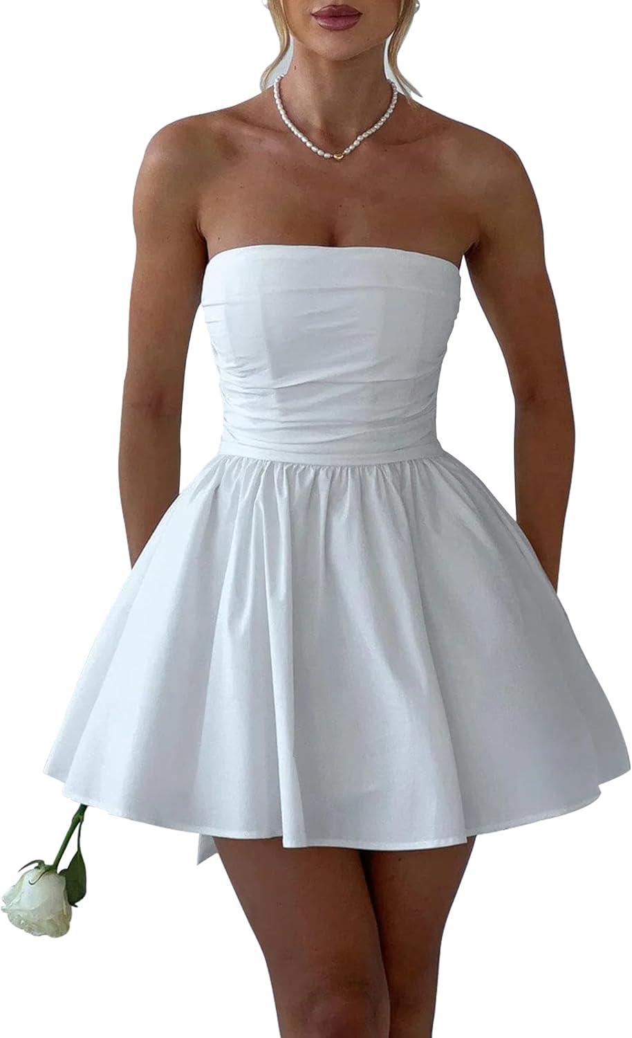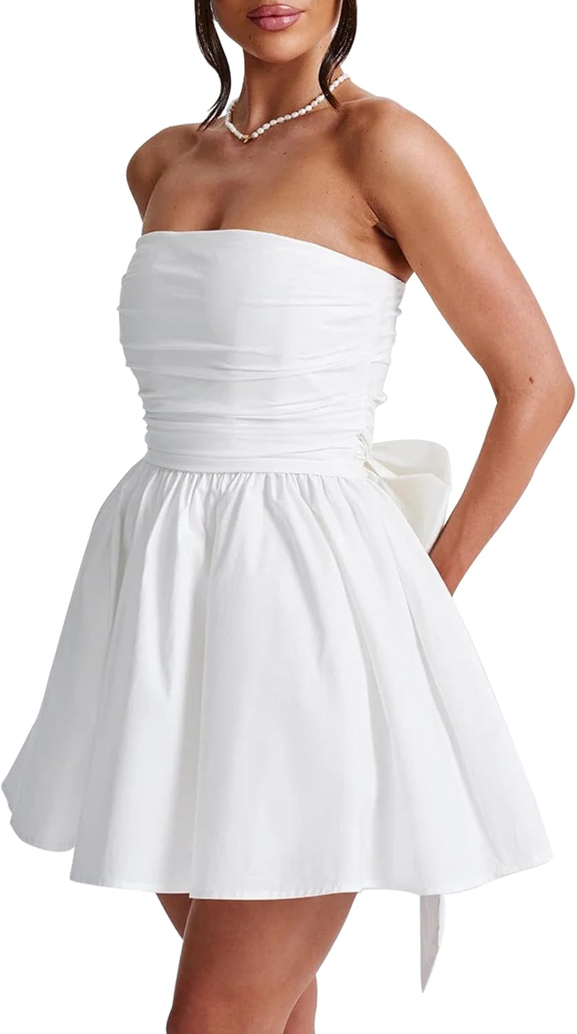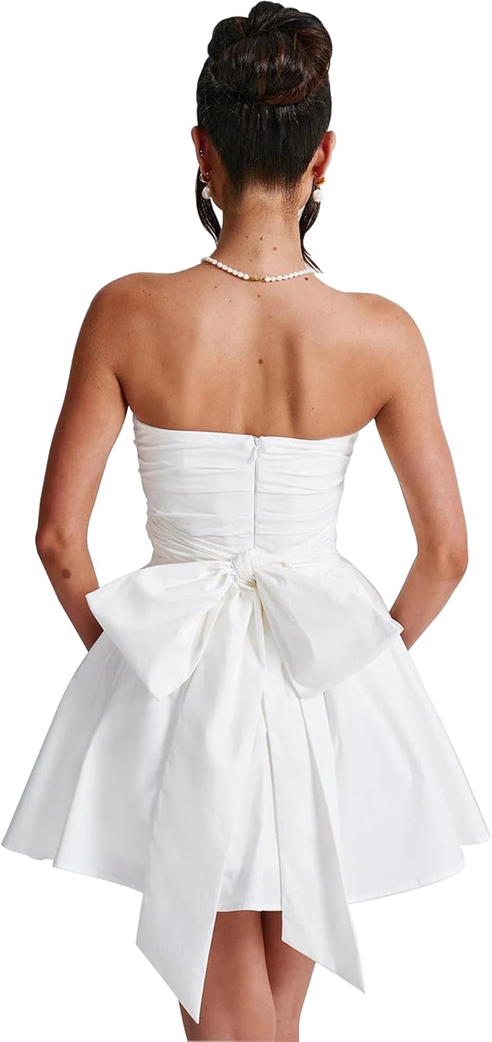 Strapless Short Dresses Ruched Bodice A Line Satin Wedding Dress with Big Bow