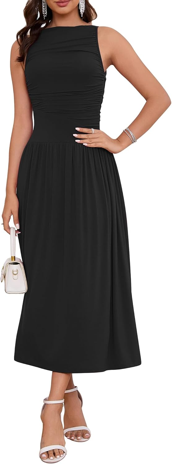 Summer Sleeveless Maxi Dress Features Flattering Soft Fabric, Ruched Waist Detail, Elegant Boat Neck, Stylish High Waist Design, Bodycon Tank Dress With A Line, Ruched Maxi Dresses For Women, High Neck Dress For Women Formal, Wedding Guest Dress, Beach Formal Dress, Long Flowy Dresses For Women.