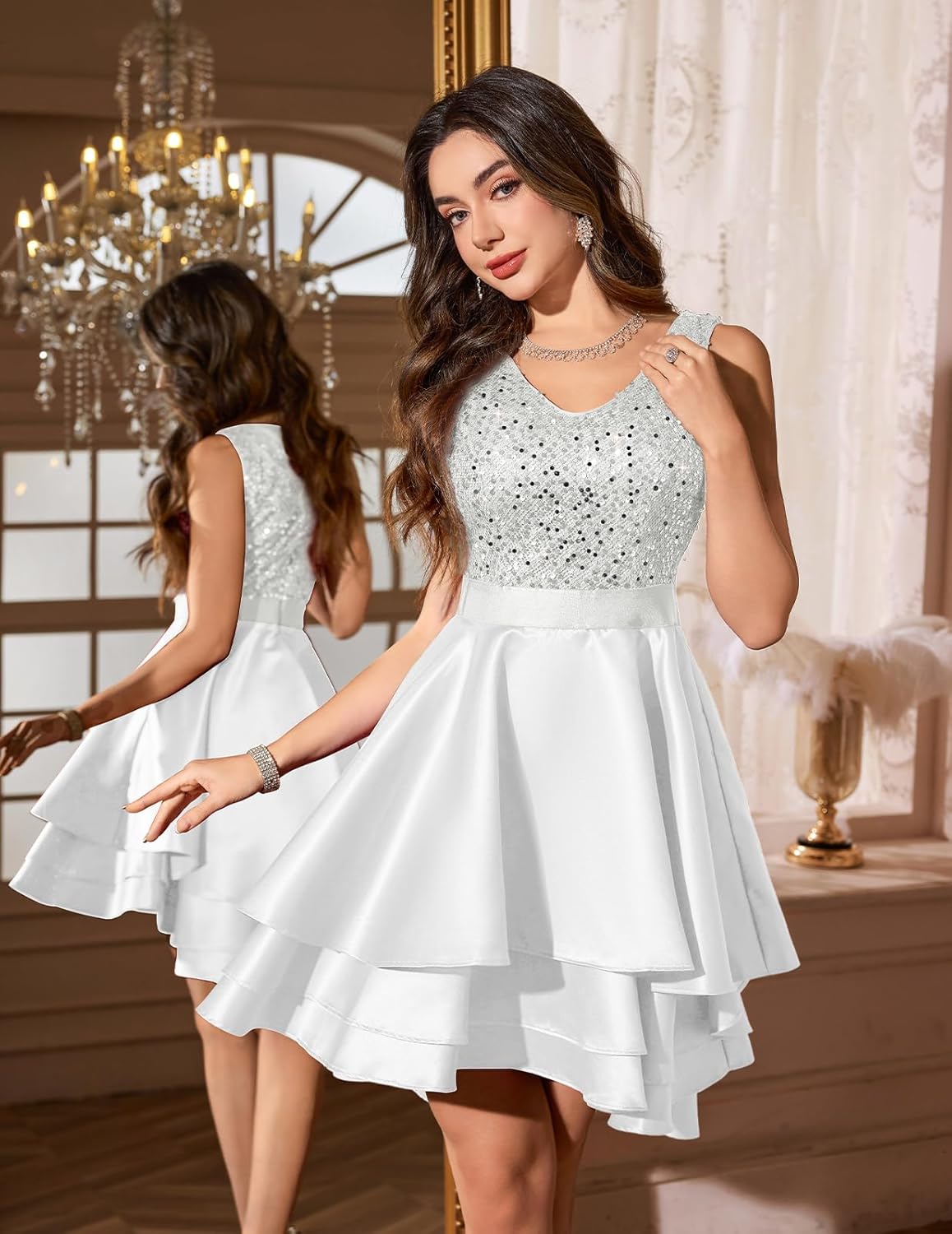 The video showcases the product in use.The video guides you through product setup.The video compares multiple products.The video shows the product being unpacked. Sequin Dress for Women Satin Cocktail Dress Merchant Video