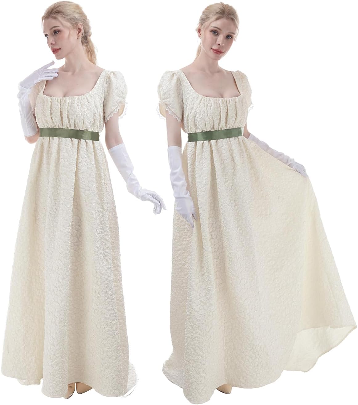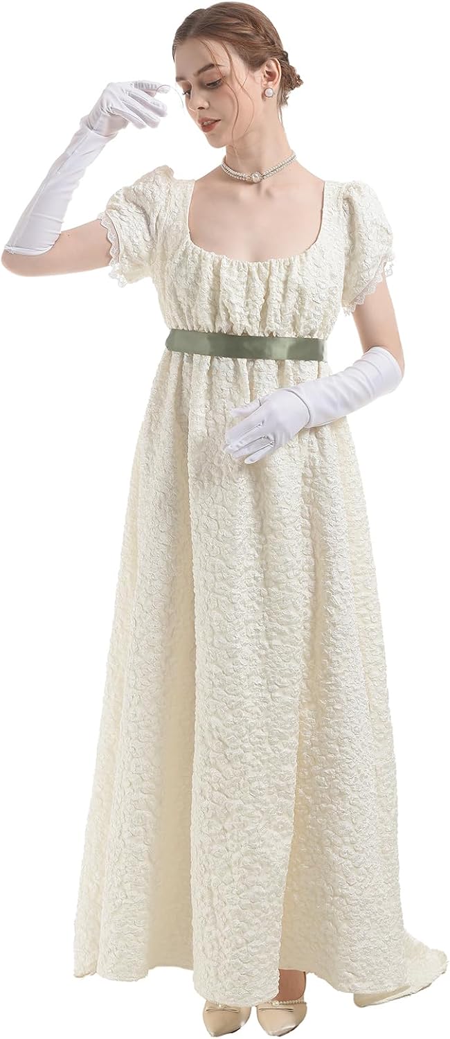 Women Regency Dress Victorian Dresses Vintage Ball Gown Lace-up Long White Regency Dress with Wedding Gloves