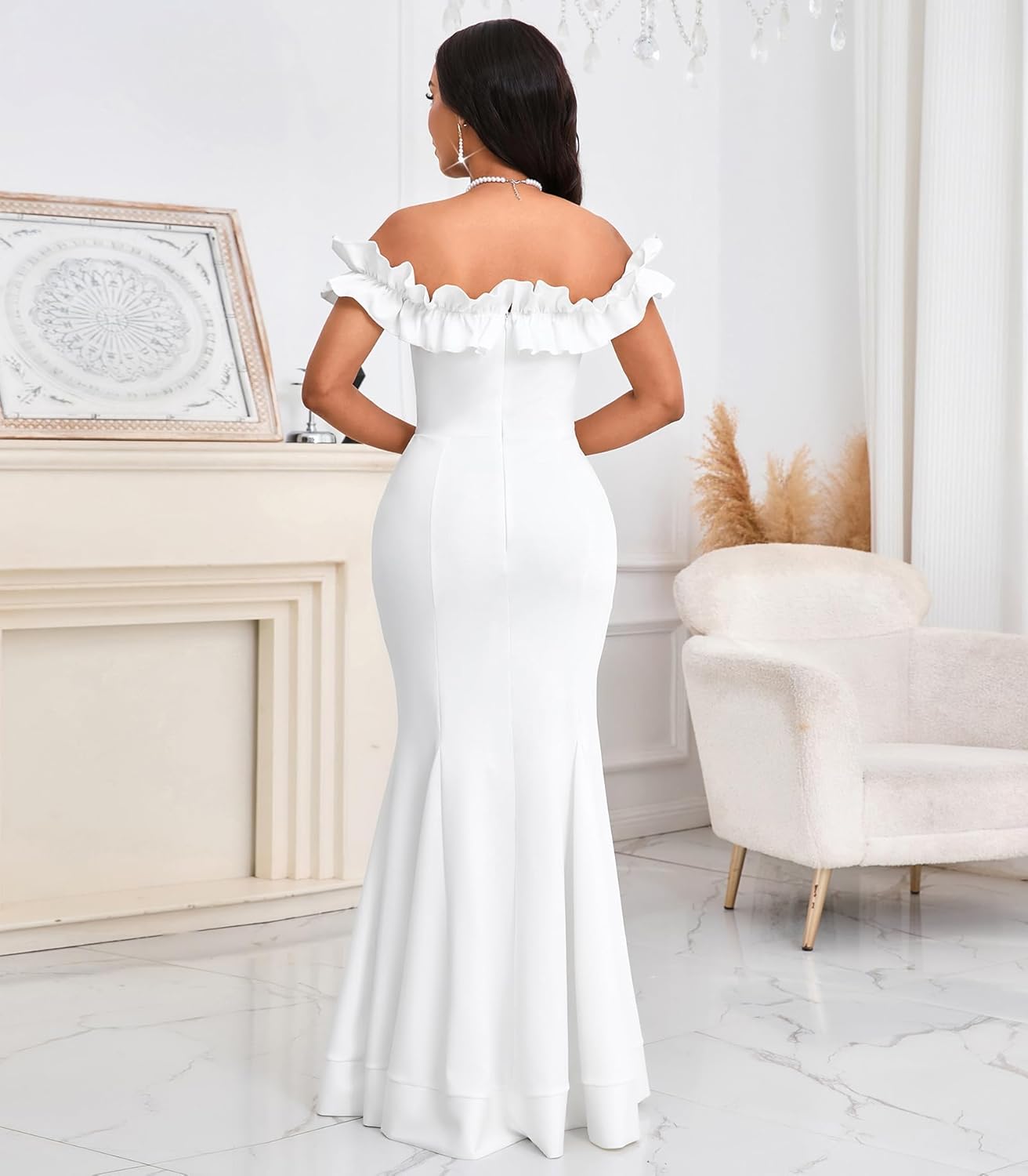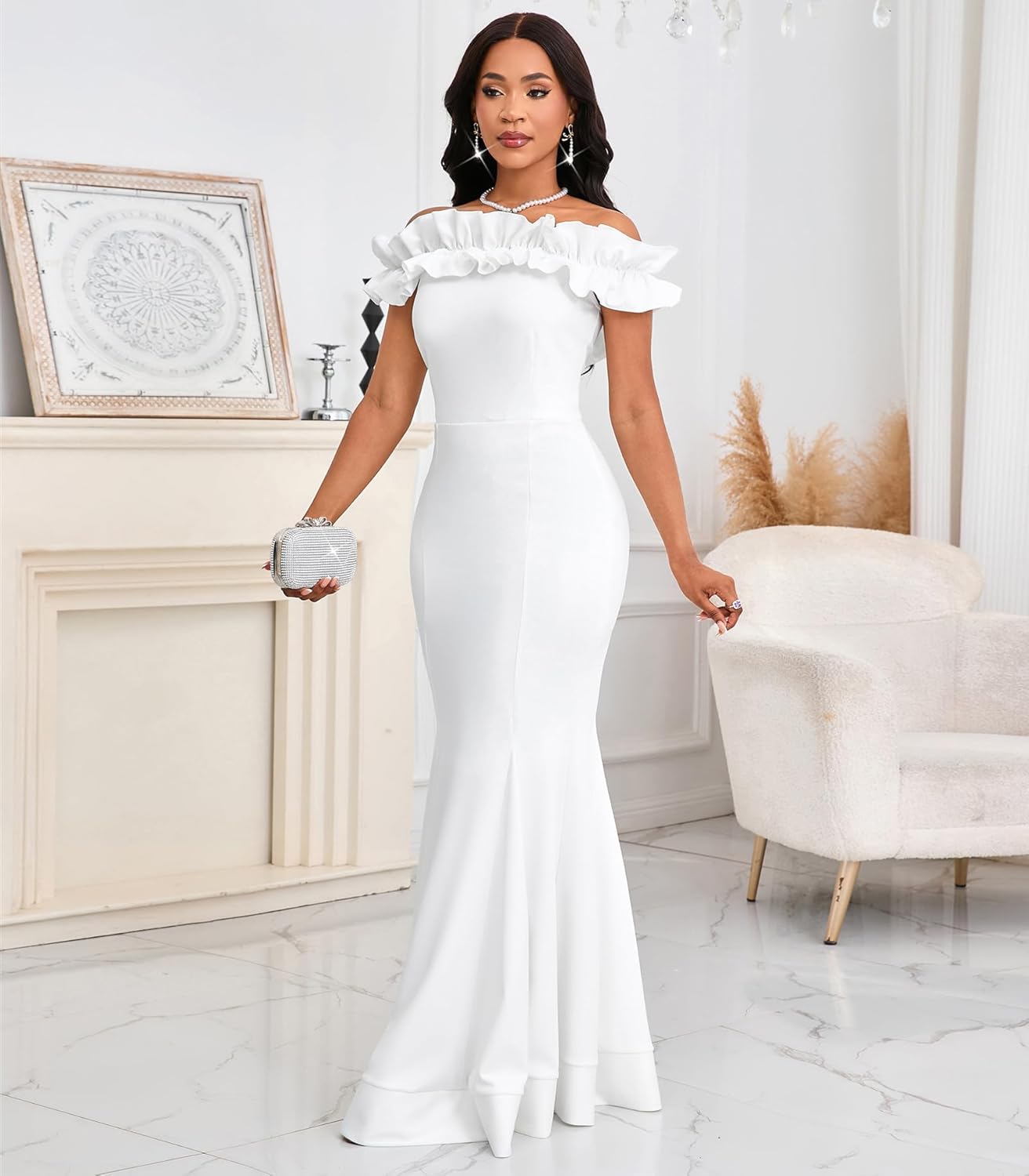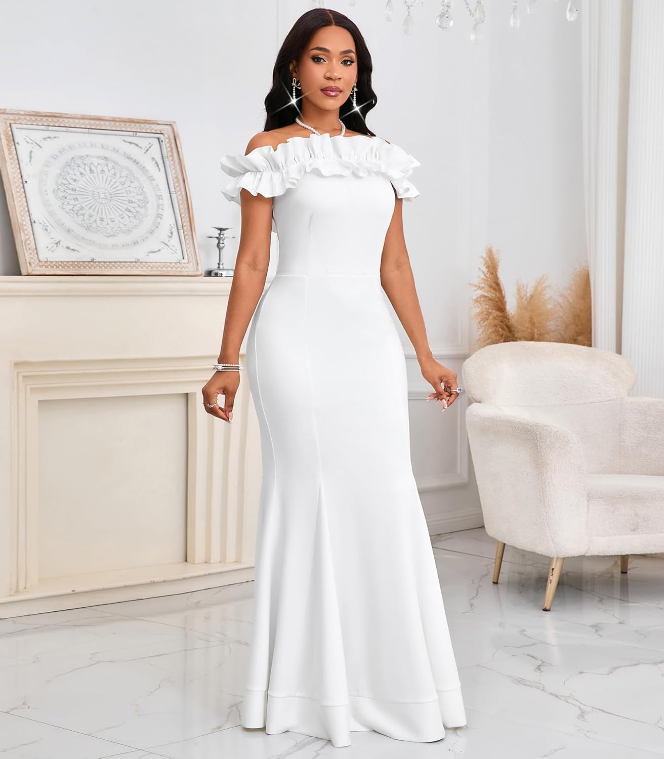 Cololura Sexy Floor-Length Off Shoulder Ruffles Stringy Selvedge Mermaid Bodycon Party Evening Maxi Dress