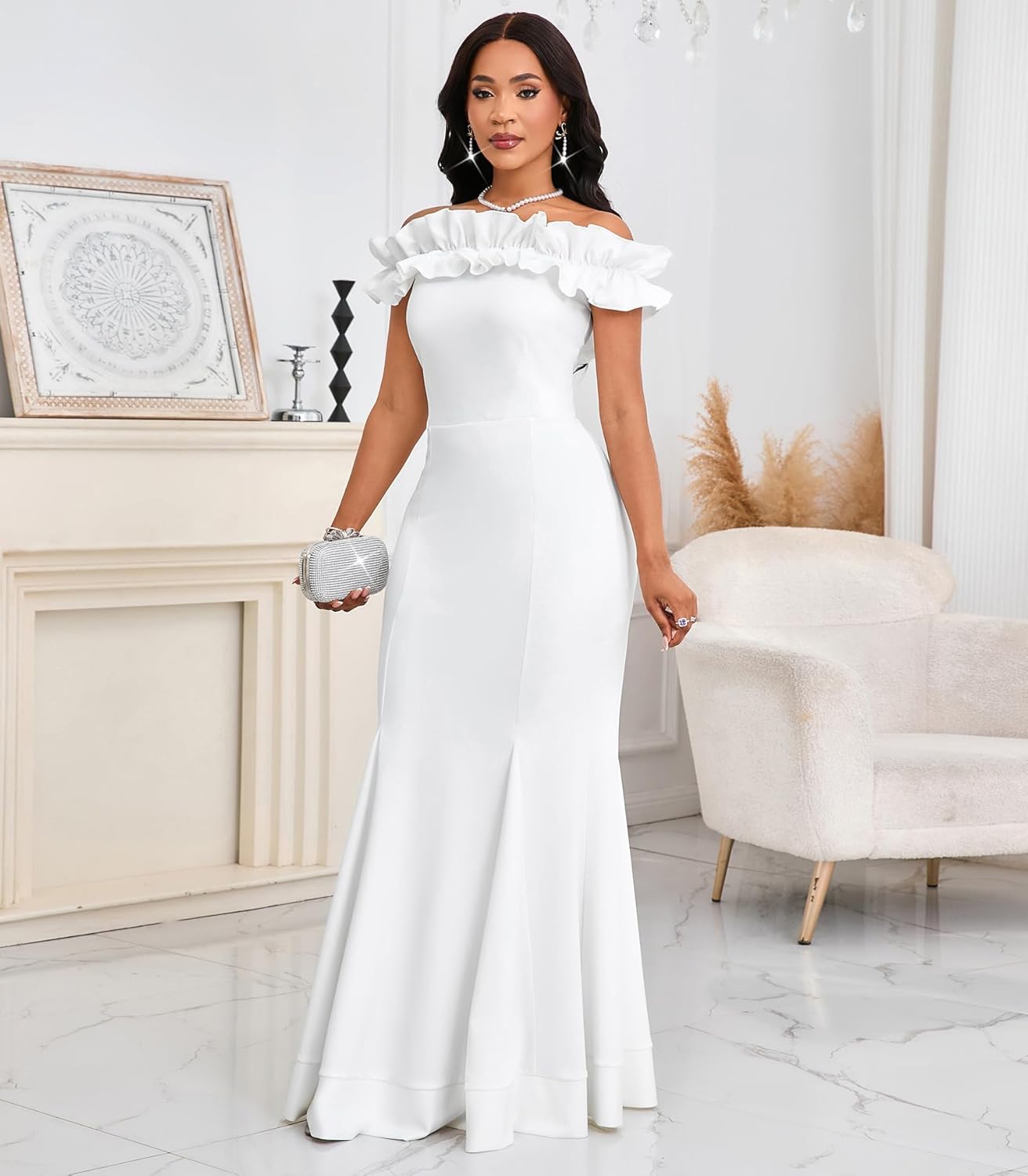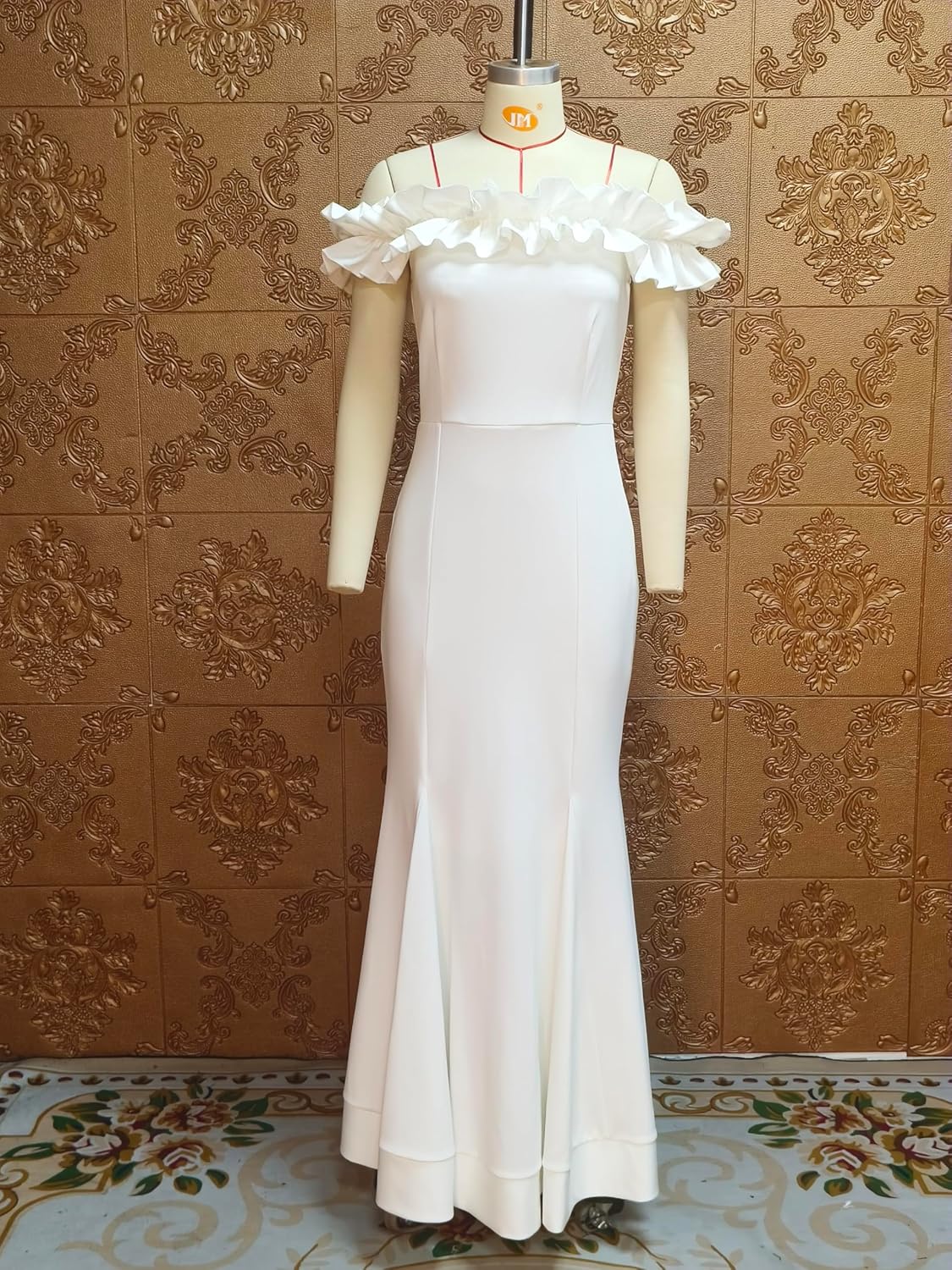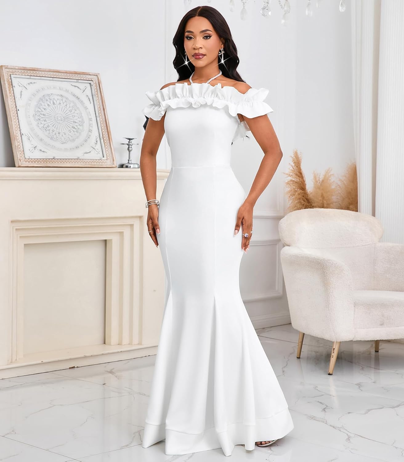 Cololura Sexy Floor-Length Off Shoulder Ruffles Stringy Selvedge Mermaid Bodycon Party Evening Maxi Dress