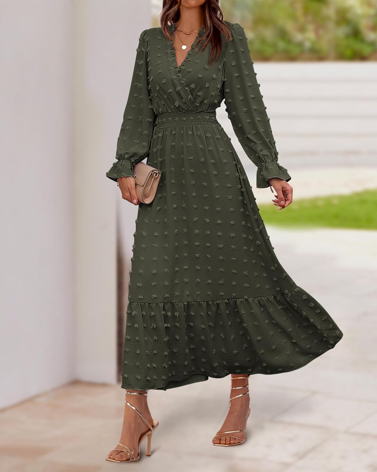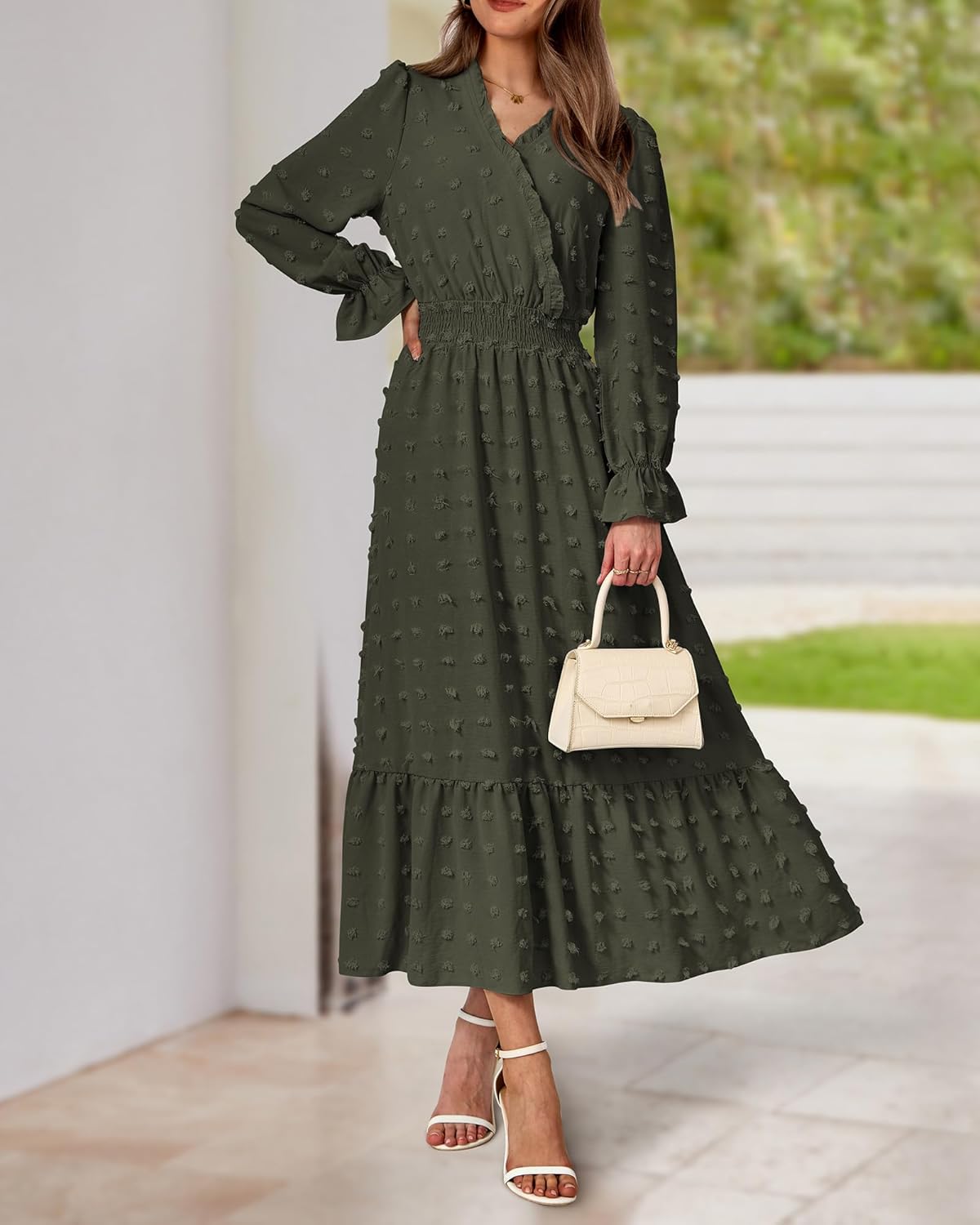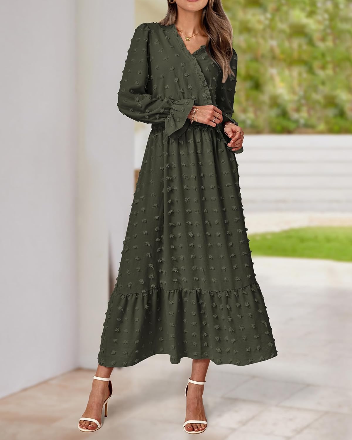 The Ruffle Long Sleeve Maxi Dress Is Made Of Lightweight And Comfy Chiffon Fabric.Trimmed With Classic V Neck, Ruffle Long Sleeves, Elastic High Waist, Cute Swiss Dots.V Neck, Ruffle Hem And Empire Waist Make The Long Dresses Suitable For Most Figures and Creates a Flowy And Flattering Silhouette.