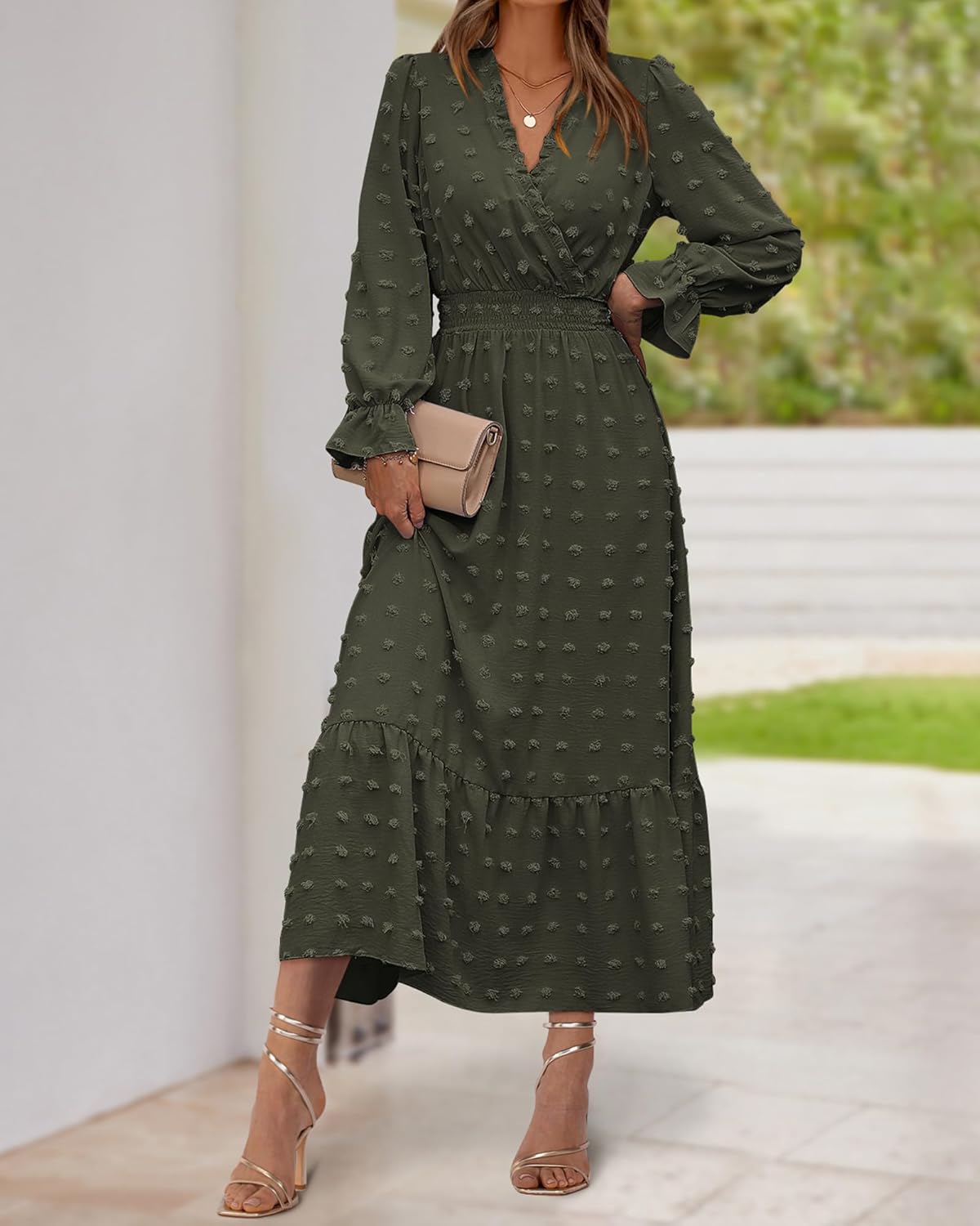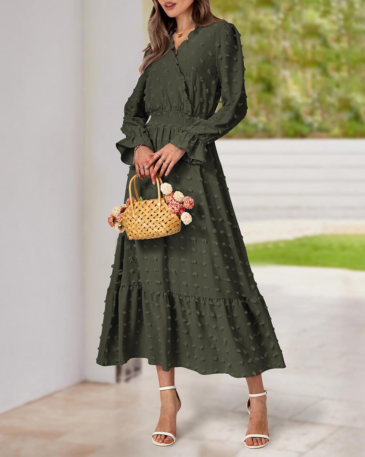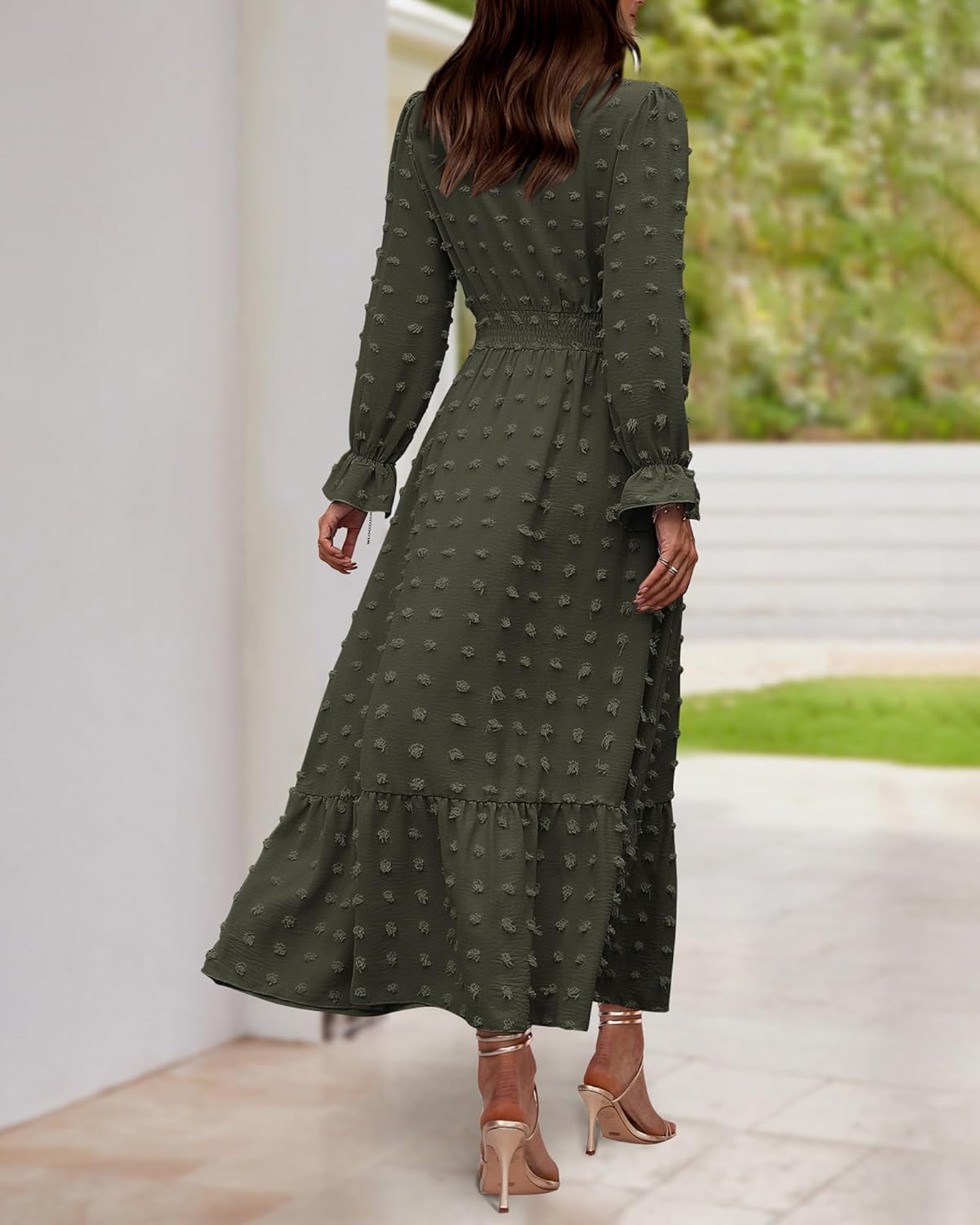 The Ruffle Long Sleeve Maxi Dress Is Made Of Lightweight And Comfy Chiffon Fabric.Trimmed With Classic V Neck, Ruffle Long Sleeves, Elastic High Waist, Cute Swiss Dots.V Neck, Ruffle Hem And Empire Waist Make The Long Dresses Suitable For Most Figures and Creates a Flowy And Flattering Silhouette.
