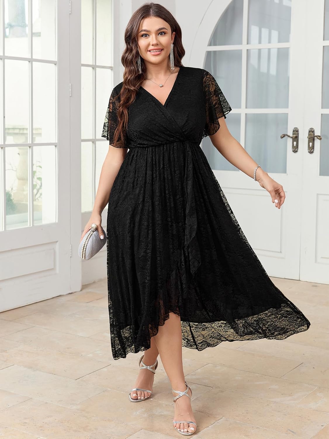 SCOMCHIC Womens Plus Size Wedding Guest Dress Formal Lace Wrap V Neck High Low Short Sleeve Cocktail Maxi Dresses XL-4XL