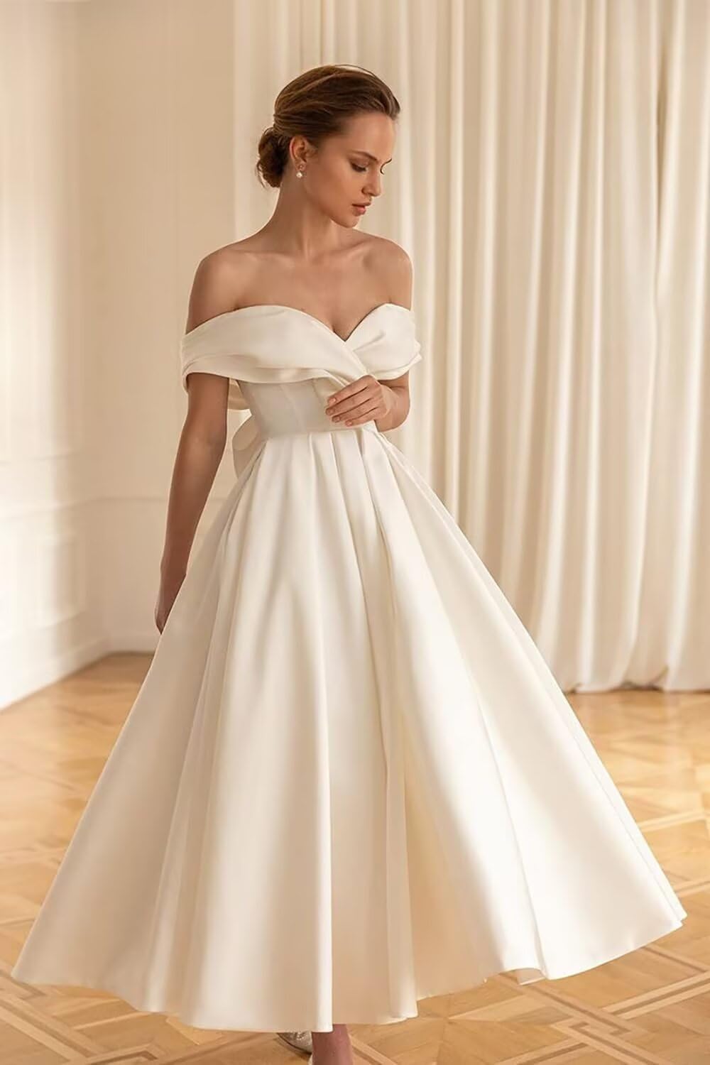 Women’s White Tea Length Wedding Dresses for Bride Midi Bridal Dress