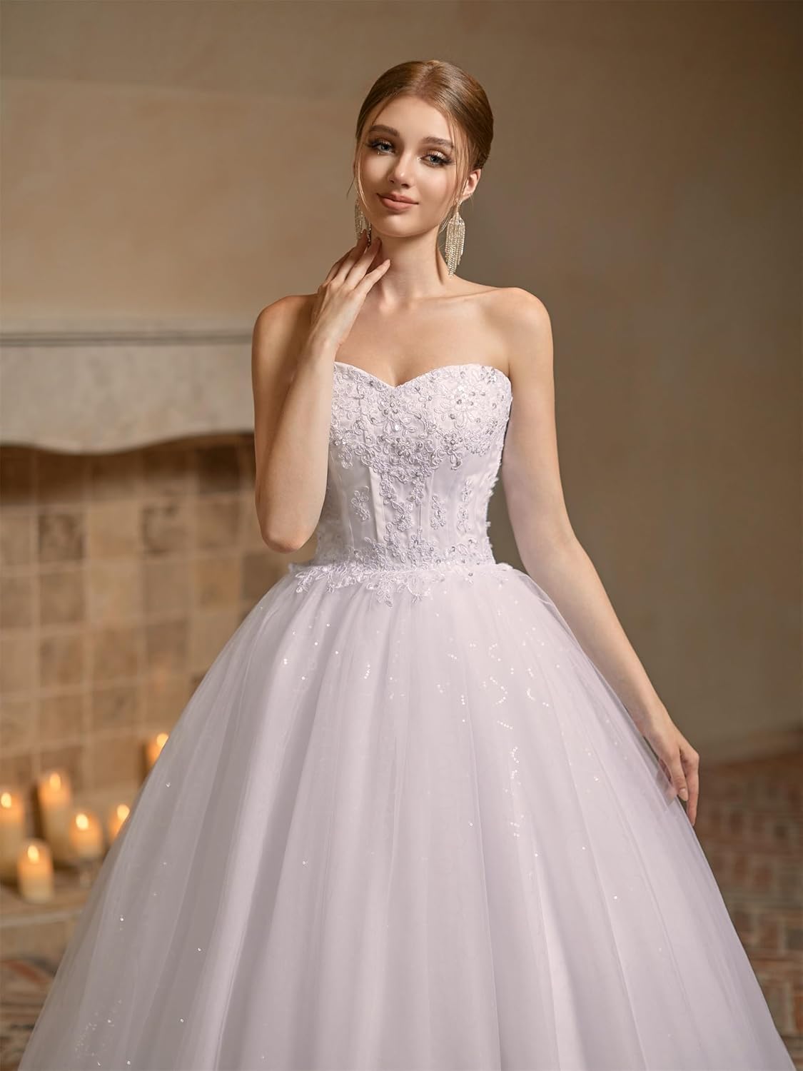 Women’s Sweetheart Applique Beaded Corset Bridal Shiny Tull Wedding Dresses for Bride