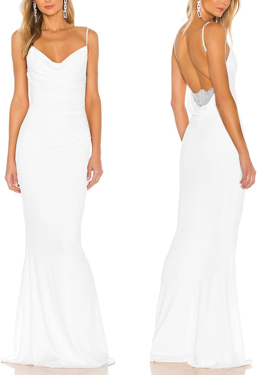 Aigeman Women Spaghetti Straps Mermaid Evening Gown Wedding Guest Dress Drape Neck Lace Backless Formal Maxi Dress 21