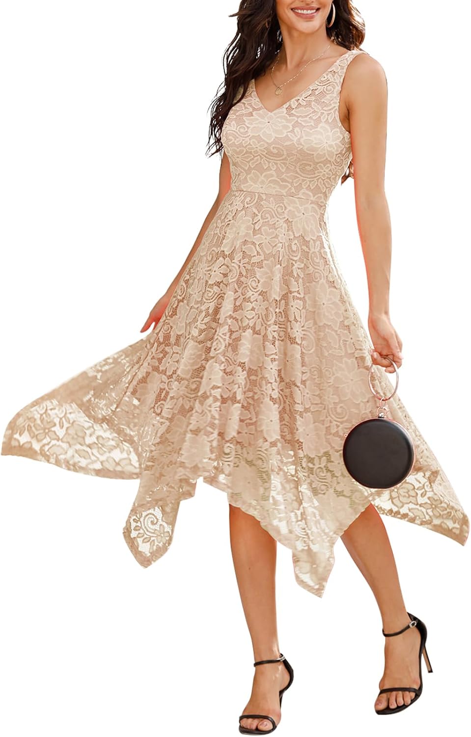 MULTIPLE CHOICE: Burgundy wedding guest dresses/ Black women’s formal dress 2024/ Blush pink bridesmaid dress for wedding/ Blue cocktail prom dresses spring/ White graduation dress for teen/ Navy mother of bride Dress/ V-neck ball gown/ Banquet Vintage dress/ Vestidos Elegantes De Mujer Para Fiesta/ Homecoming dress. COMFY FABRIC: This lace cocktail dress is made of high quality lace fabric with soft lining, comfortable and smooth, very flattering to natural curves. With this evening gown, you would definitely look charming and sparkly. STYLISH DESIGNS: Womens Asymmetrical dress/ A-line handkerchief hem dress/ Sleeveless dress/ Knee length dress/ Double v-neckline dress/ Empire waist dress for women/ Flowy dresses for women/ Irregular hem Dress. TRENDY STYLE: The classy prom dress can be dressed up with sparkling earrings and your favorite high heels, make you more feminine. This modest bridesmaid dress is very suitable for formal occasions, such as prom, formal party, ball, evening party, cocktail, photoshoot, homecoming, birthday, graduation, etc. FITS YOUR FIGURE PERFECTLY: You can wear this swing party dress alone in spring and summer, eye-catching and graceful. Empire waist dress with elastic waistband highlights your slimming waistline. Easy to put on and take off. Perfect addition to your wardrobe for a wedding or any dressy occasion.
