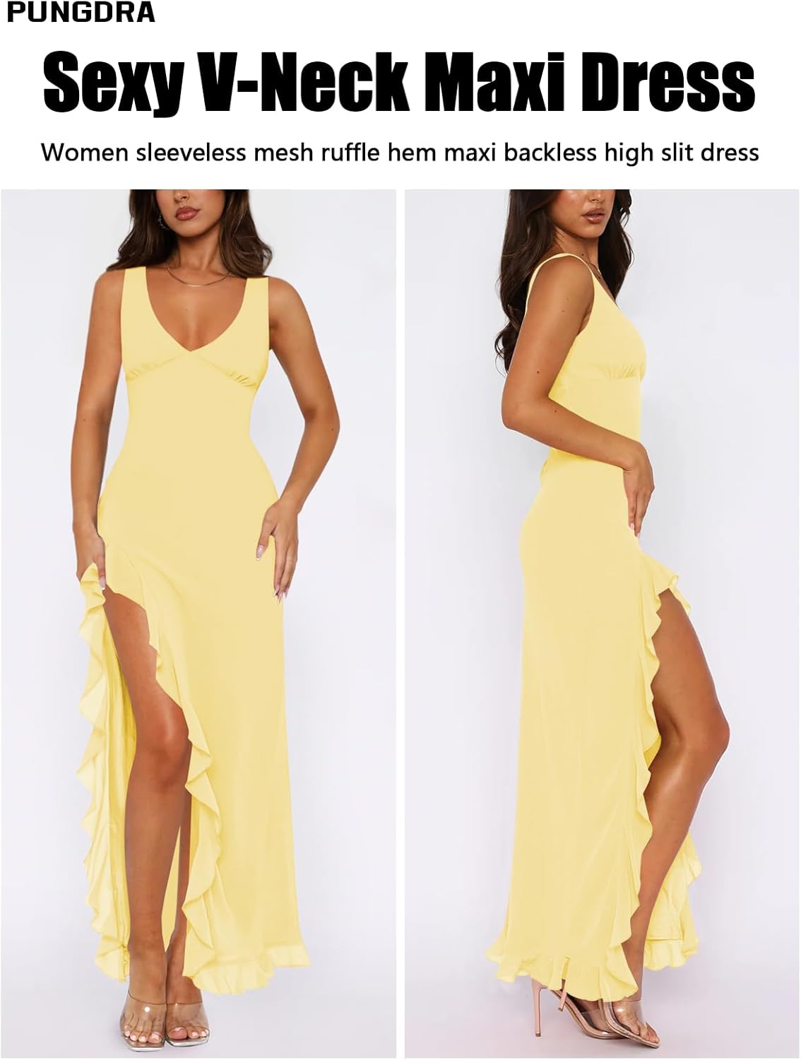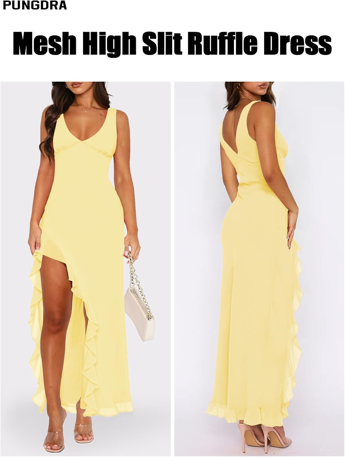 Women’s Sexy V Neck Mesh Ruffles Hem High Slit Bodycon Maxi Dress for Women Formal Cocktail Wedding Guest Dresses