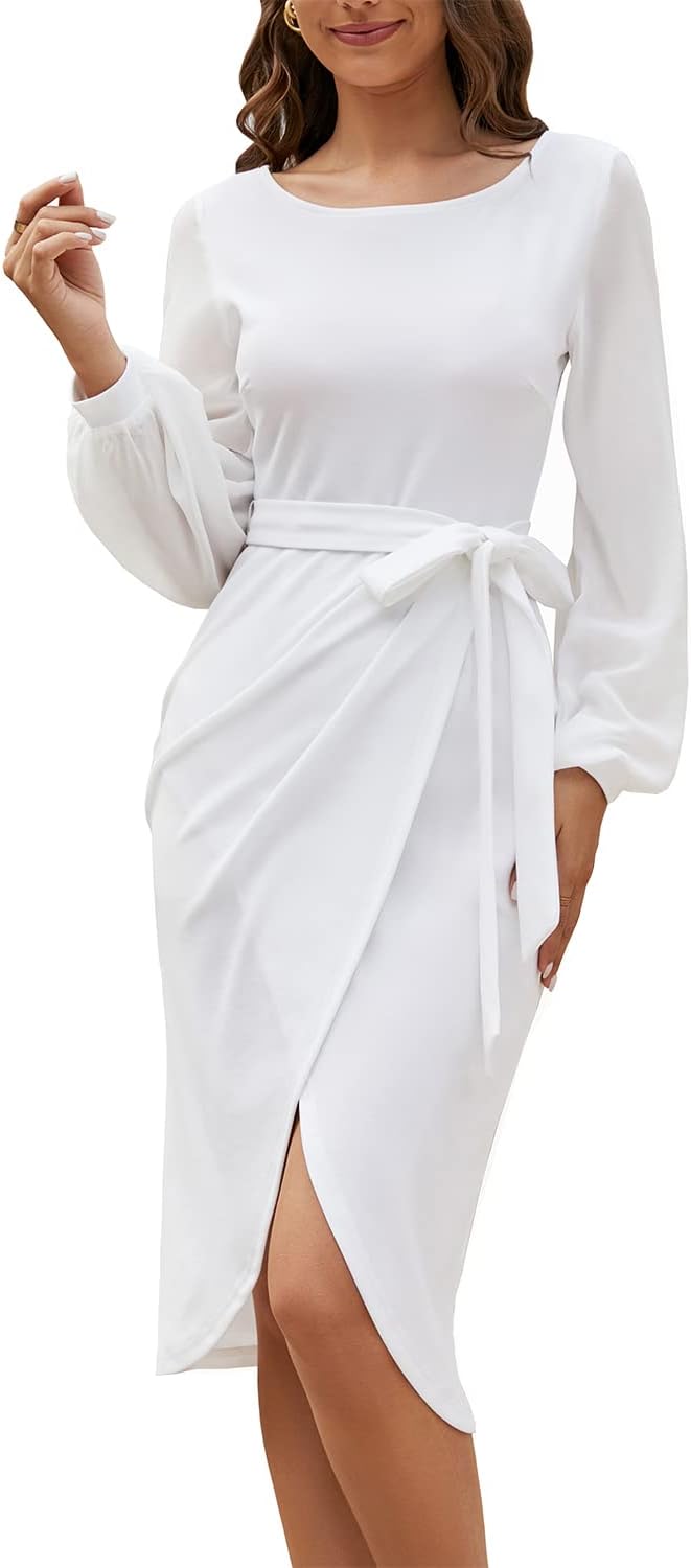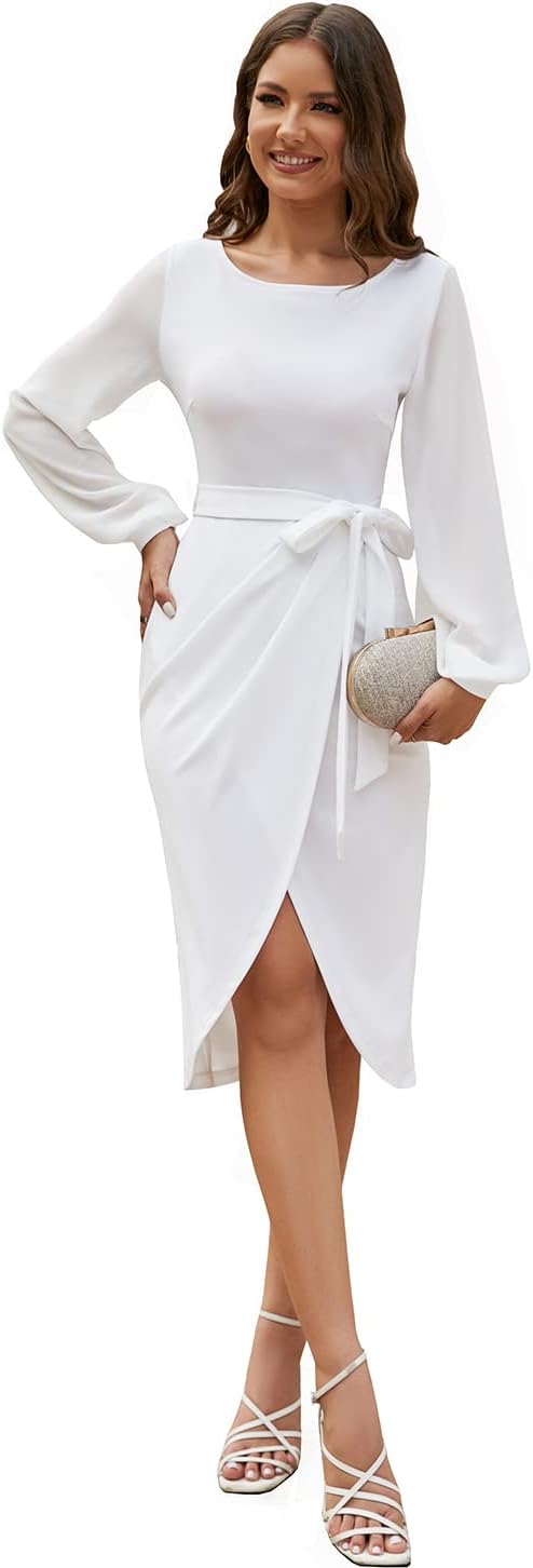 Comfy fabric: This stylish dress is made of high-quality Modal and spandex. Soft fabric makes it comfortable to wear to any event. Sleeves fabric: chiffonDesign: Chiffon long sleeve dress, V-Back, round neck, self belted, hidden zipper, midi length, elegant and casual style, split dress is classic while sexy, looming your beauty legs. slim comfort bodycon fit and they will fit your body in a very flattering way. Colors: Black, White, Navy Blue, BurgundyFeatures: Semi-formal cocktail dresses for women in spring and summer, simple solid color and slim fit style underline the casual but classic touch and never out of date. A stylish waist wrap tie design is better for hiding a small tummy. The front split makes charming legs look slimmer visually while creating a looming feeling. You can pair it with sky-high heels and stylish bags for a fascinating look.Occasions: Perfect dress for casual work, formal, semi-formal, night dating wear, bridesmaid, wedding party, vacation, streetwear, birthday gifts, vacation, a play, beach, brunch, dinner, outdoor, honeymoon, anniversary, casual, homecoming, graduation, school dance ect. Suitable for dating, going out, nights out, office, cocktail parties, and everyday wear.Elegant style, Fit like a glove, Fit and flare dresses for women, Junior girls cocktail dresses, wedding guest dress for teenagers, the simple elegant design can be worn on many occasions according to what you accessorize. You can wear this on your holiday or at a party. Seasons: spring, summer, fall