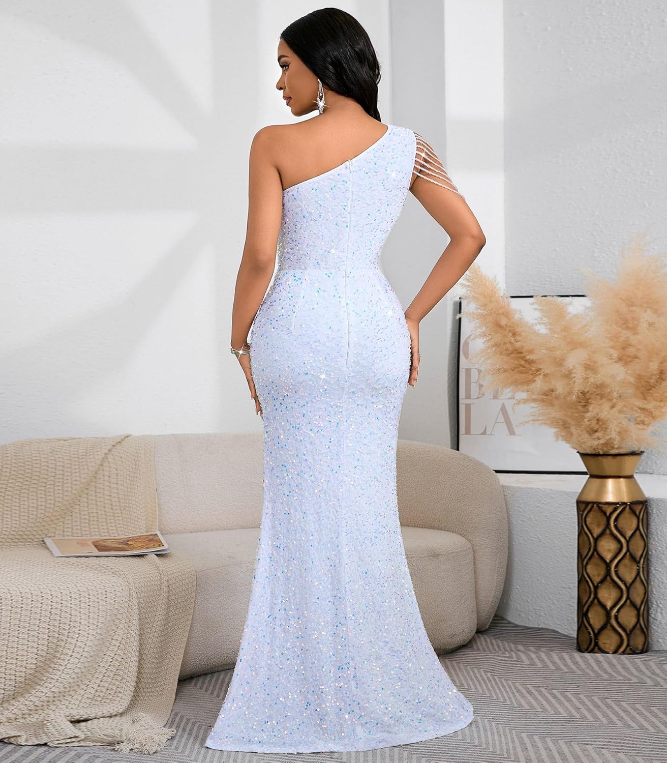 The video showcases the product in use.The video guides you through product setup.The video compares multiple products.The video shows the product being unpacked. Cololura Sexy One Shoulder Formal Dress Merchant Video
