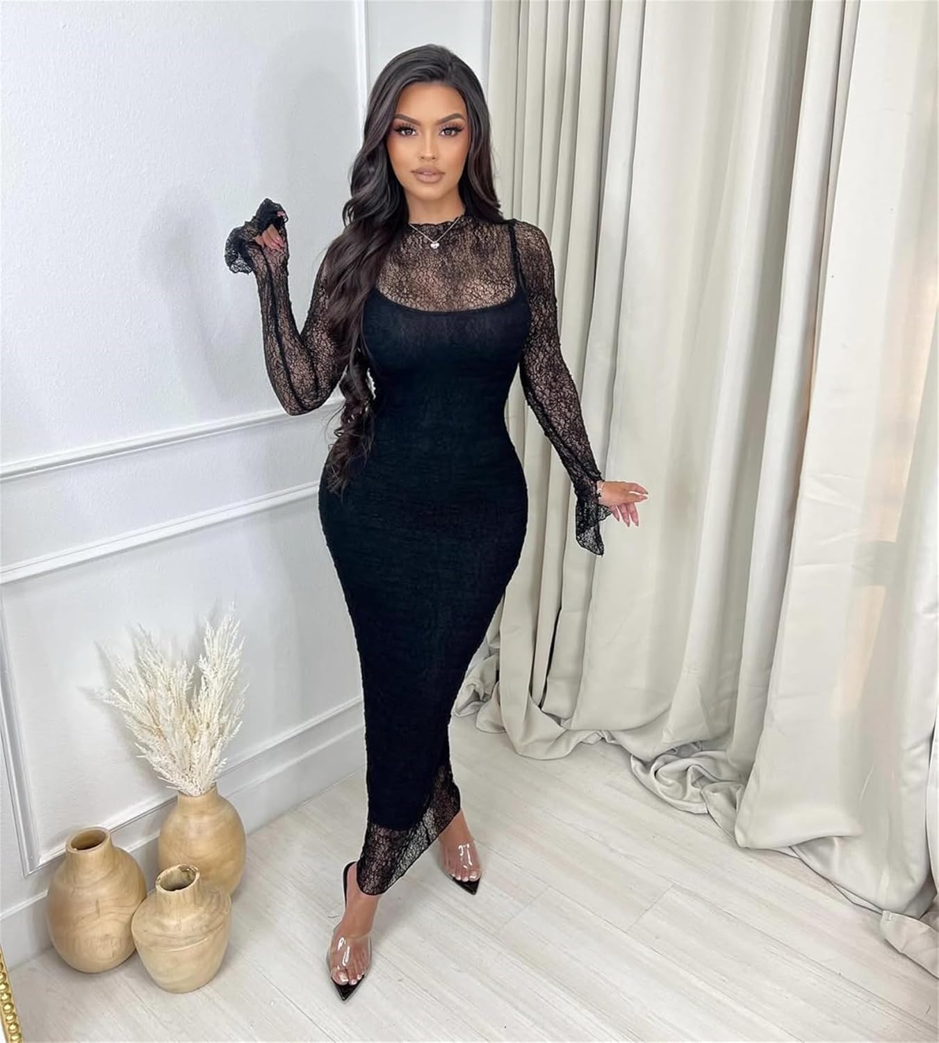 CALEBGAR Lace Sheer Mesh Long Sleeve Slim Fit Long Dress purple dress for woman light purple dress for woman