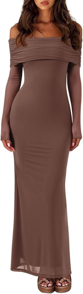 Product description Women Off Shoulder Bodycon Ruched Maxi Dress The video showcases the product in