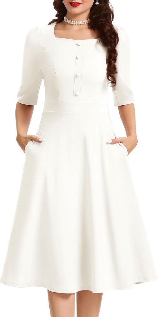 Bbonlinedress Vintage Cocktail Dress Women Formal Wedding Guest Church Modest Square Neck Tea Dress with 3/4 Sleeve