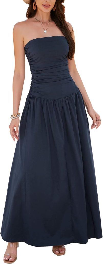 Product description Yulaviniee Women’s Summer Strapless Ruched Flowy Casual Maxi Dresses The video showcases the