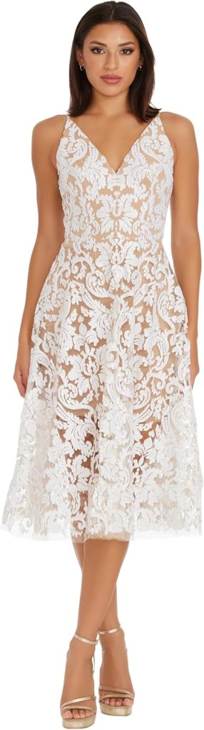 Plunging spaghetti strap fit and flare midi with sequin-lace fabric Item model number :