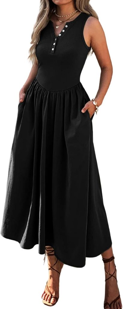 Product description Women’s Summer Casual Sleeveless Maxi Sundress Patchwork Knit Dress V Neck Button Down