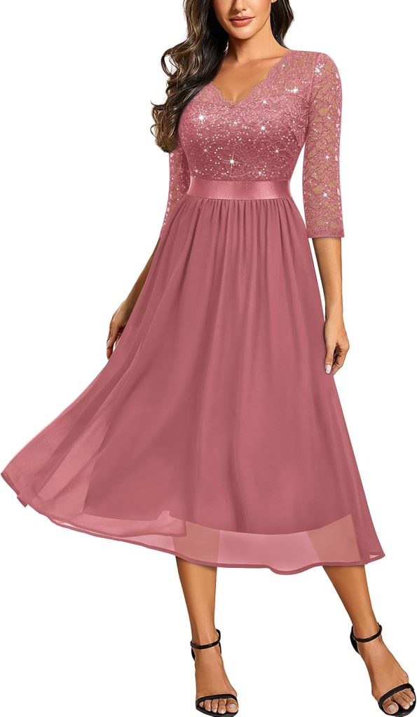 Miusol Women’s Elegant V Neck Sequin Lace Sleeve Bridesmaid Party A-line Dress