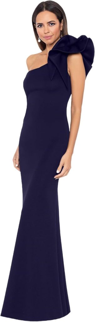 Turn heads in this sleek one-shoulder gown featuring a dramatic bow detail and a floor-length