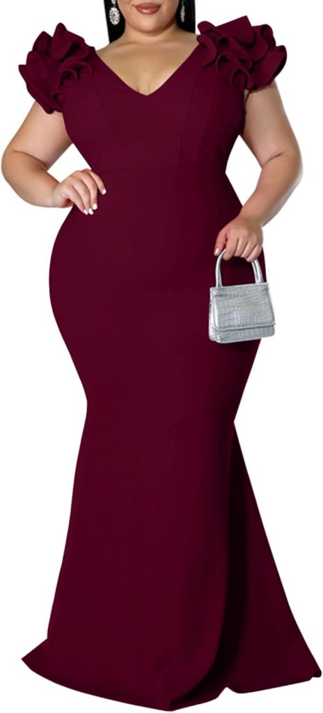 Product description Ekaliy Plus Size Elegant V Neck Ruffle Sleeves Bodycon Mermaid Hem Maxi Dress