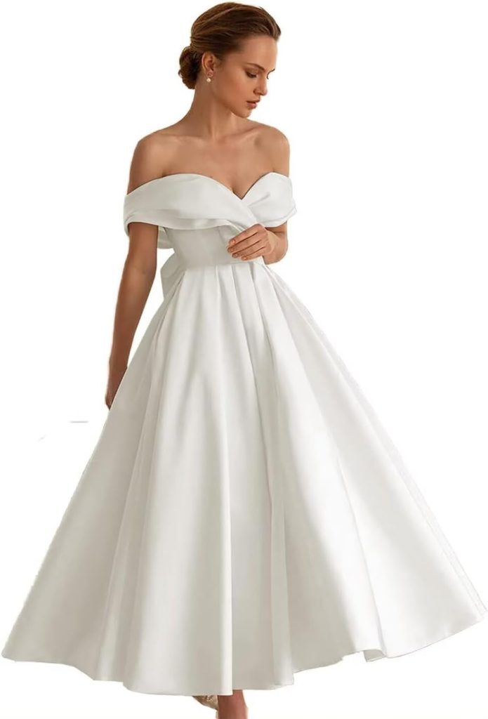 Product description White Tea Length Wedding Dresses for Bride Midi Satin V Neck Bridal Shower