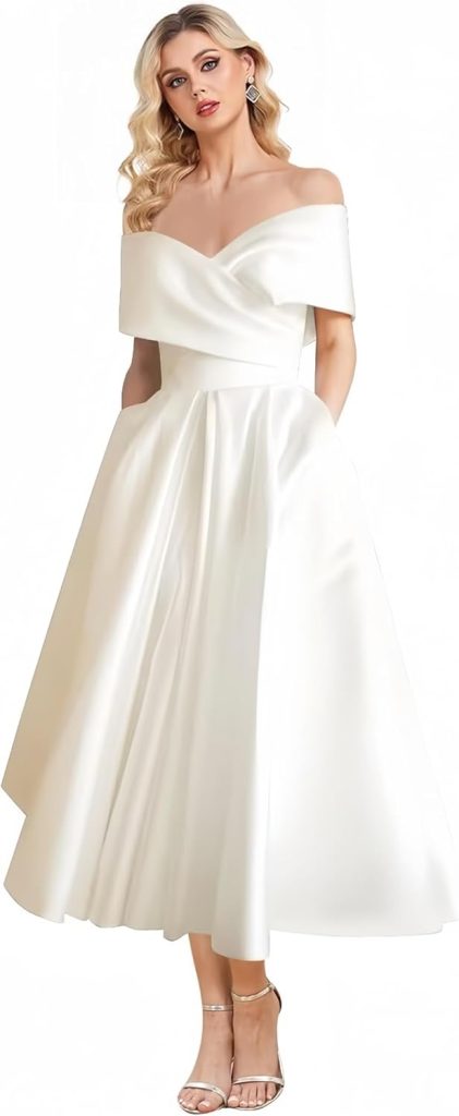 Product description Off the Shoulder Wedding Dresses Satin Tea Length Prom Dresses for Womens The