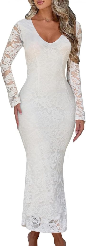 Ekaliy Women Bodycon Maxi Dress 2025 Fall Floral Lace Elegant Flare Sleeve Fitted Formal Wedding Guest Cocktail Dresses