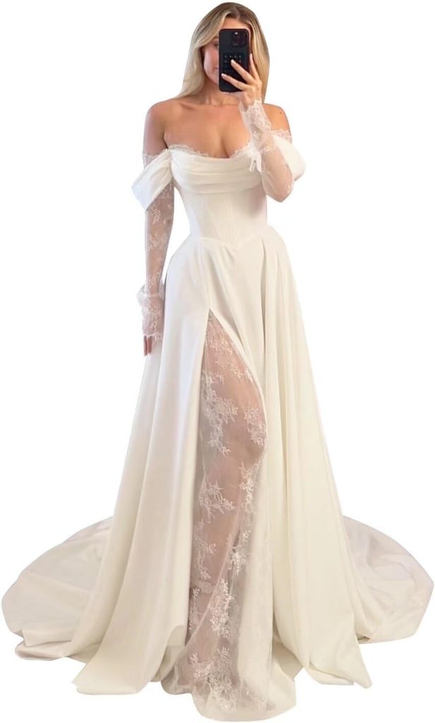 Off Shoulder Satin Wedding Dresses Lace Long Sleeve Prom Dresses Corset A-Line Ball Gowns with Slit