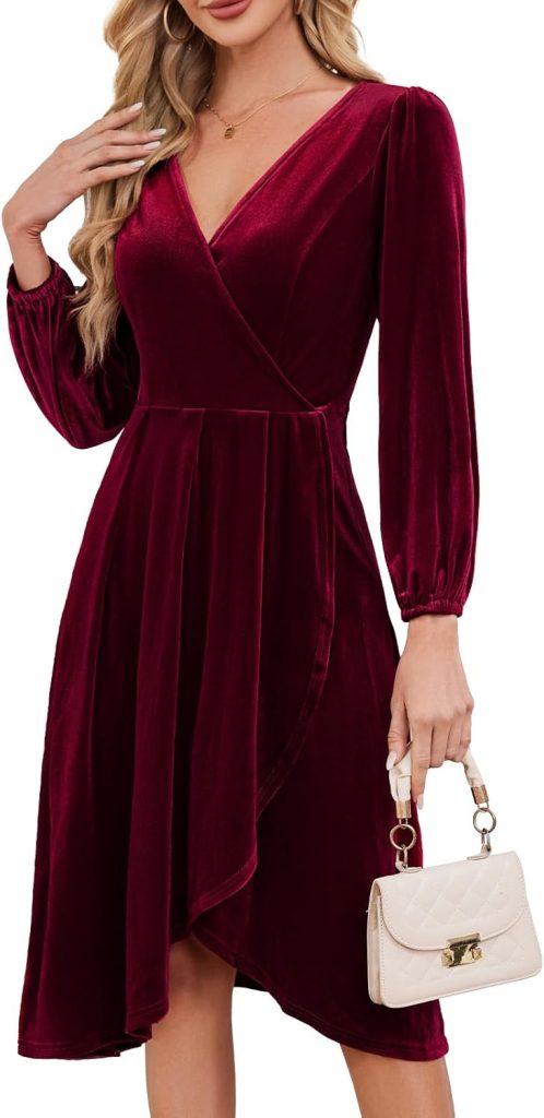 Meetjen Women’s V Neck Velvet Formal Long Sleeve Dresses Flowy Fall High Low Elegant 2025 Midi Winter Cocktail Party Dress