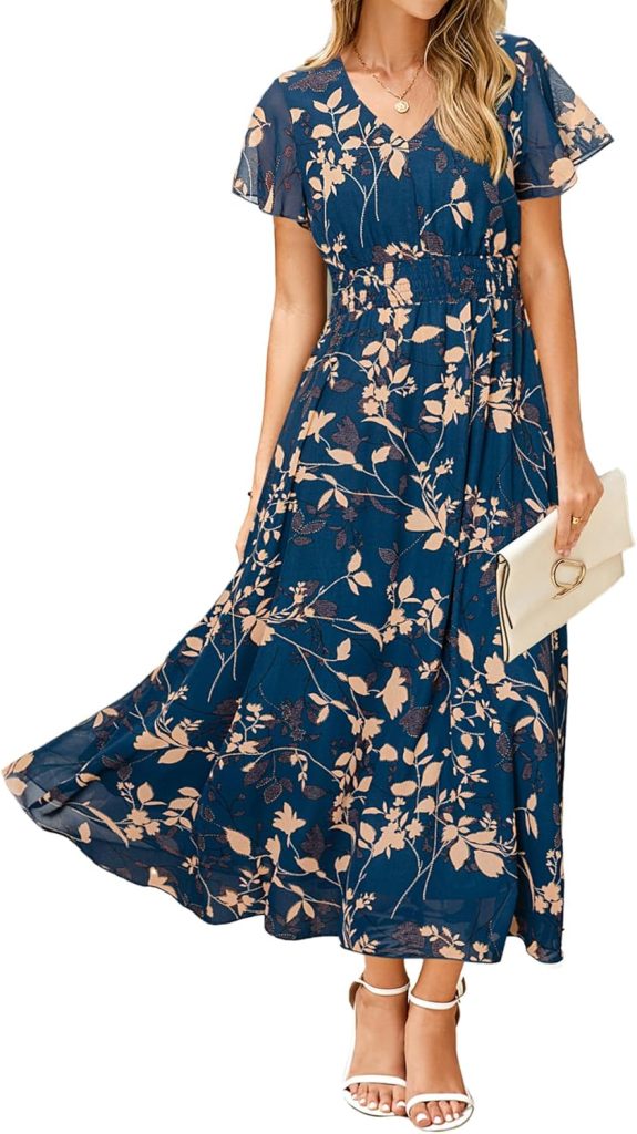 Simplee Womens Floral Maxi Dress Short Sleeve Summer Boho Wedding Guest Dress Empire Waist Chiffon Modest Midi Dresses
